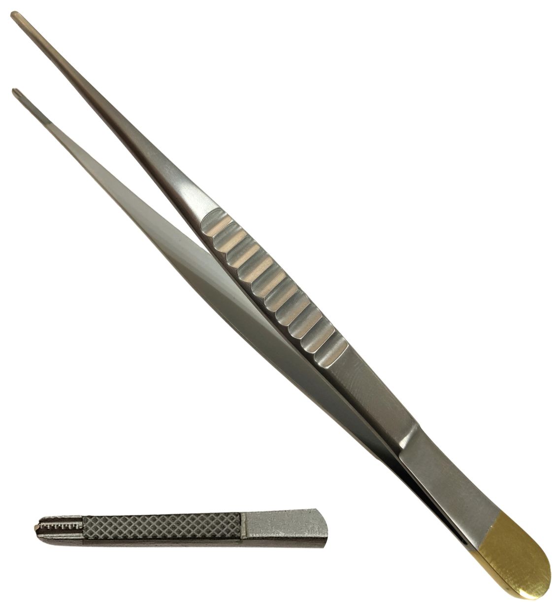 - Выполнен в виде двух пружинящих металлических пластинок, расходящихся под углом 18 градусов, общей длиной 155 мм, с плоской ручкой с насечкой, шириной 10 мм, губки шириной 1 мм на дистальном конце. На рабочей части губок имеется продольная мелкозубчатая атравматичная продольная насечка (1 и 2 ряда сверху и снизу соответственно) длиной 2 мм и платформа, армированная твердым сплавом с перекрестной насечкой - длиной 10 мм. Кочики прилегают при закрытии инструмента плотно друг к другу.